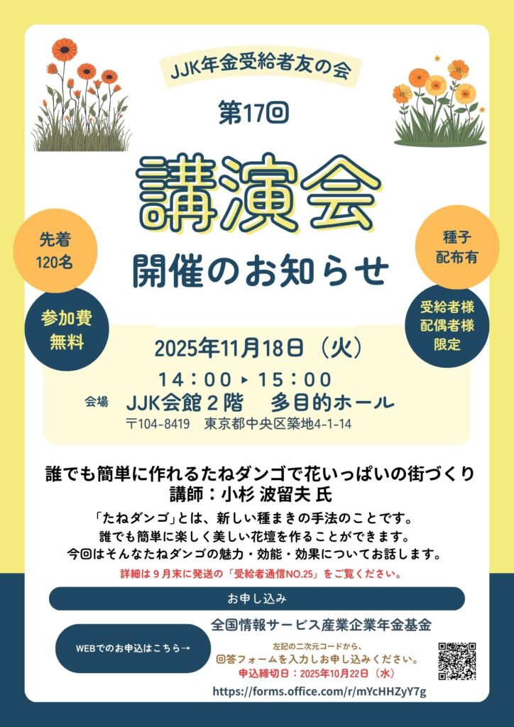 2025年10月8日 / 最終更新日 : 2025年10月8日 sanson_0056 受給者の方 年金受給者友の会「第17回講演会」参加申込受付中! 年金受給者様を対象とした「年金受給者友の会 第17回講演会」の参加申込を受付しております。多くの皆様のご参加を心よりお待ち申し上げております。 詳細案内(受給者通信No.25)はこちらから 参加申込はこちらから